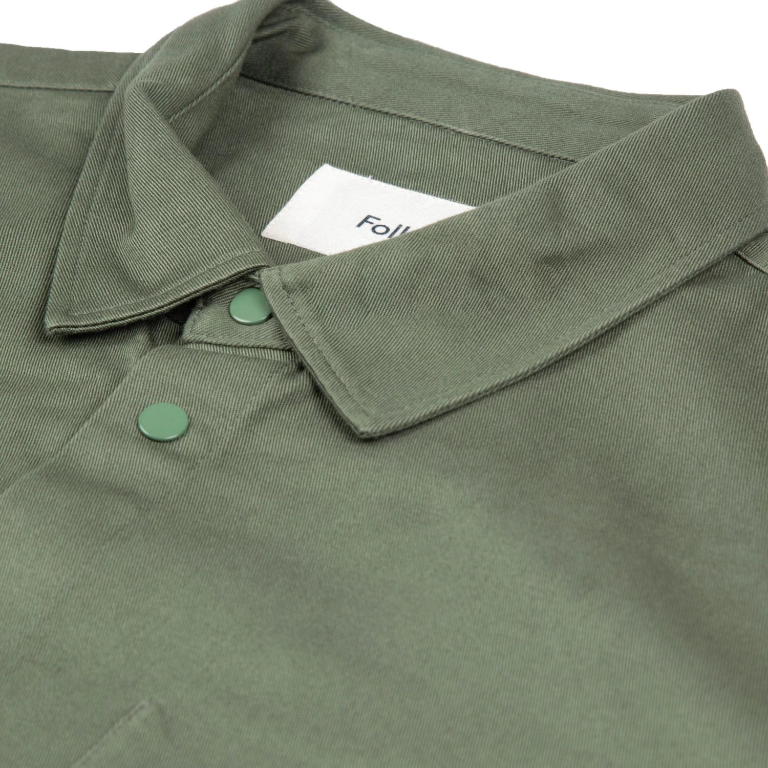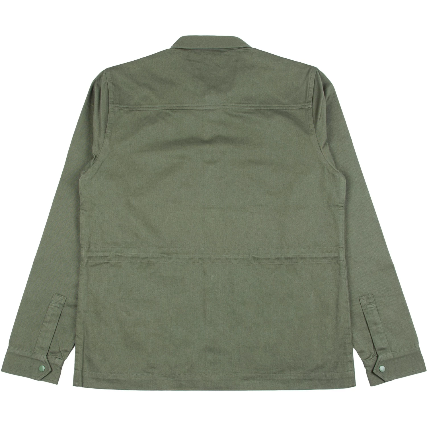 > Metal snap stud fastening at hem, collar stand and cuffs.