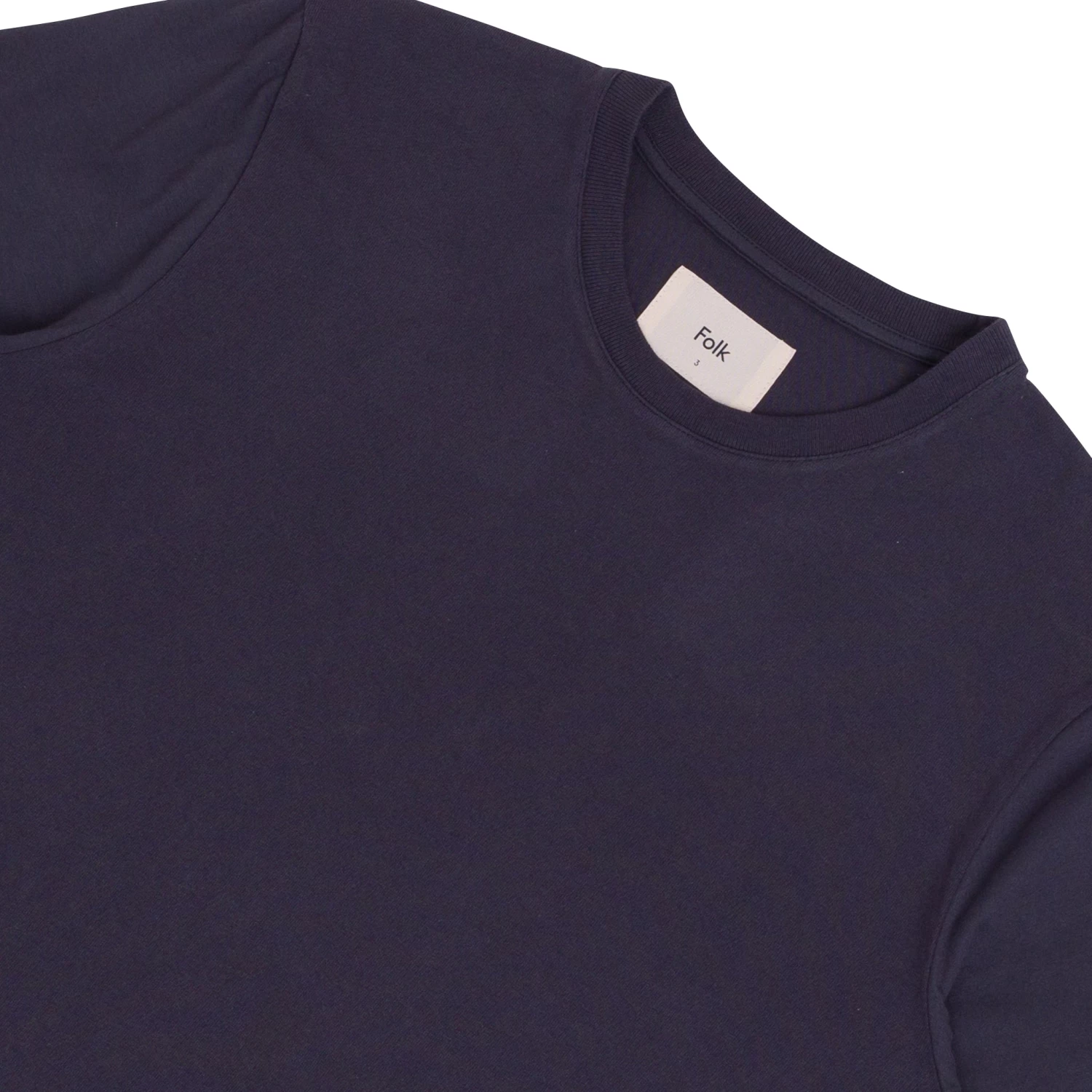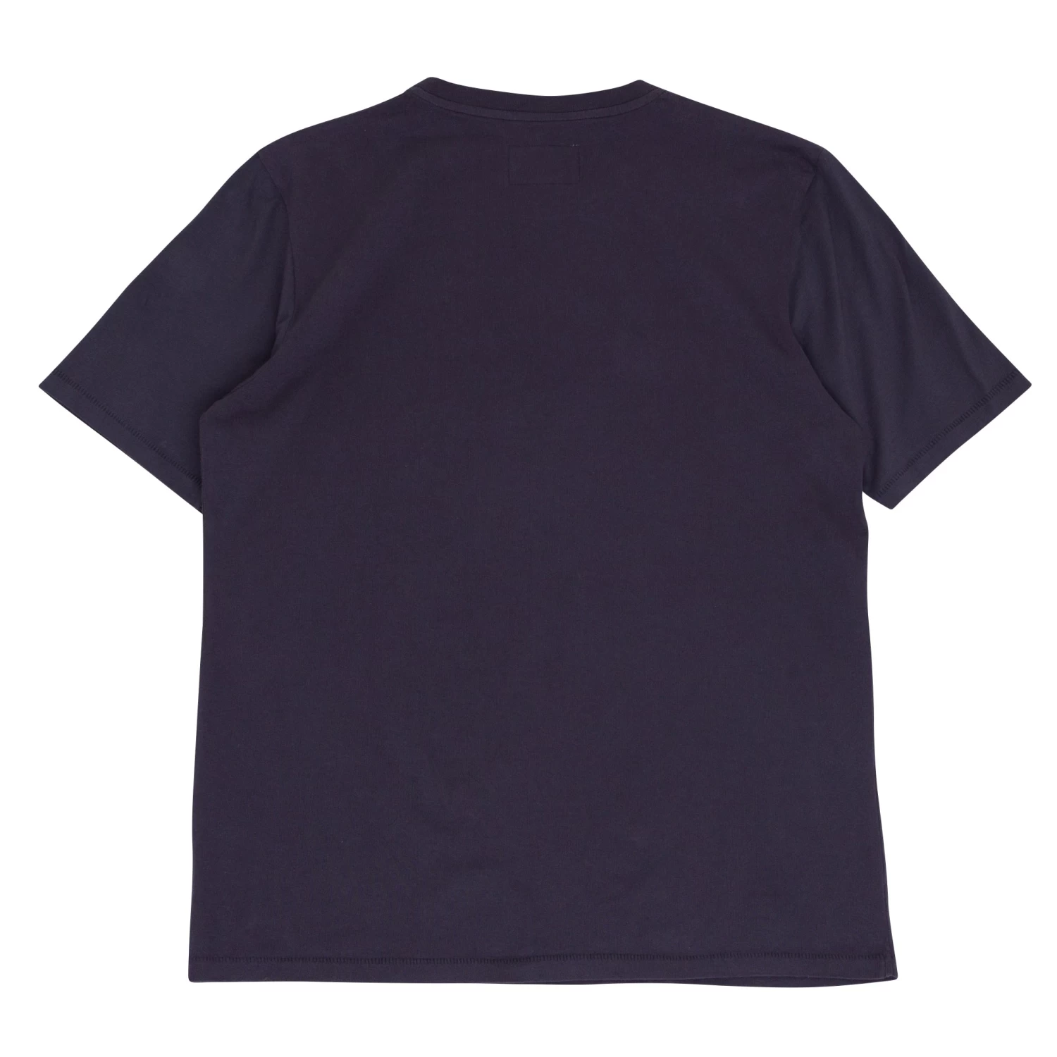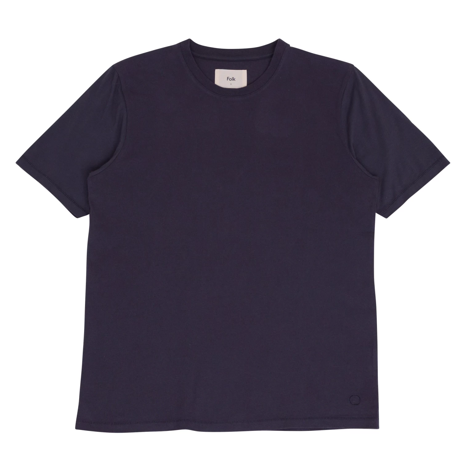 Circular, chain-stitched branding at hem.