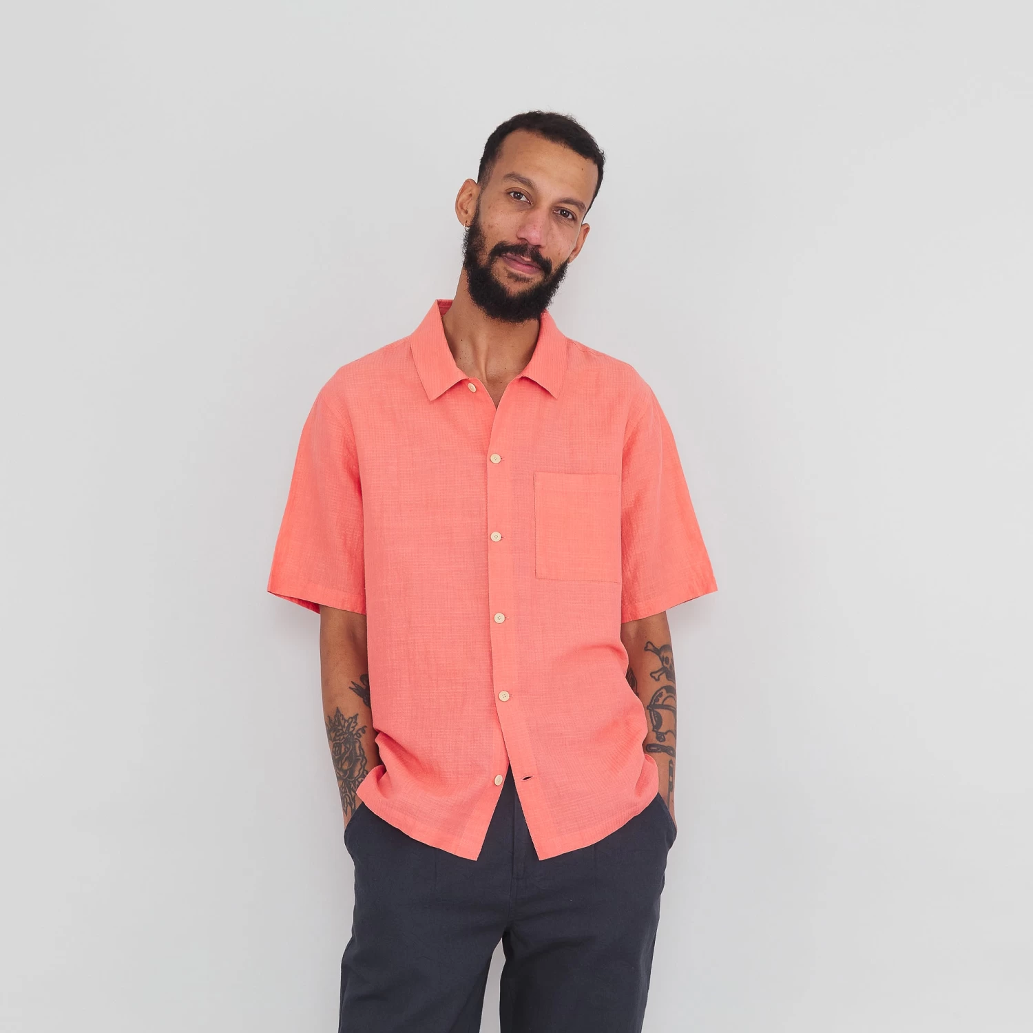 Boxy, relaxed fit short-sleeve shirt with a spread-collar.