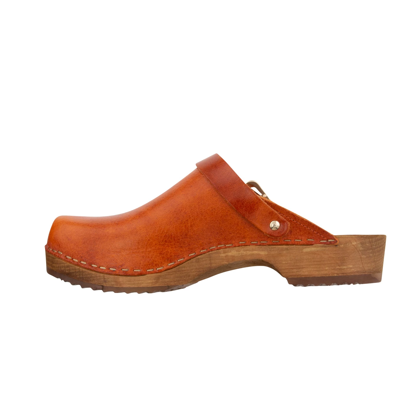 Our Low Klassisk clog with strap has stapled leather uppers with a rounded toe, an open back and an adjustable strap to the back. The strap can be worn around the ankle for added support or as a detail over the front. The dark Alder wood base has a low 30mm heel. All of our wooden bases are ergonomically shaped inside and out for comfort and have a rubber grip on the sole. With time and wear both the leather and wooden base will soften and begin to mould to the shape of your foot.